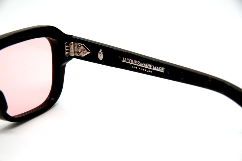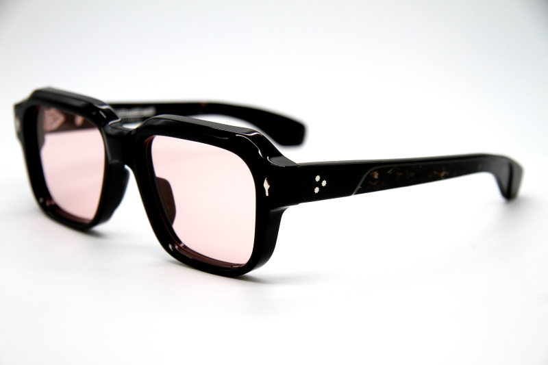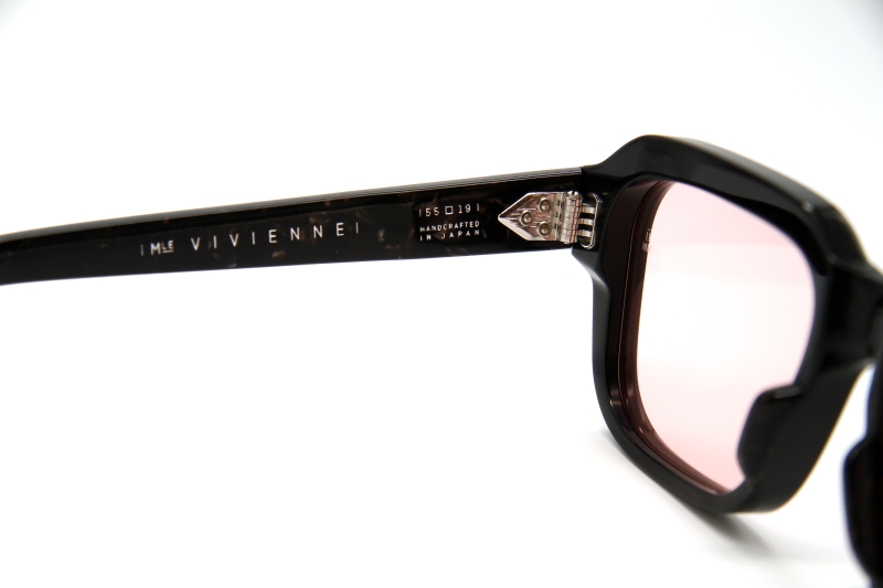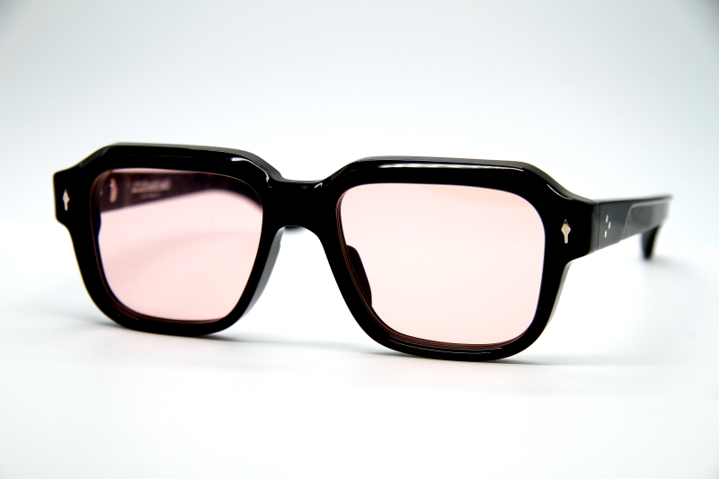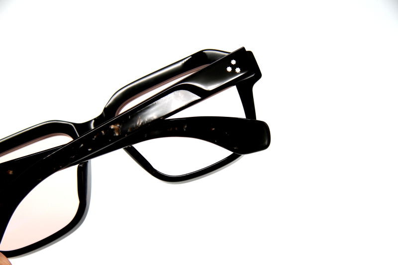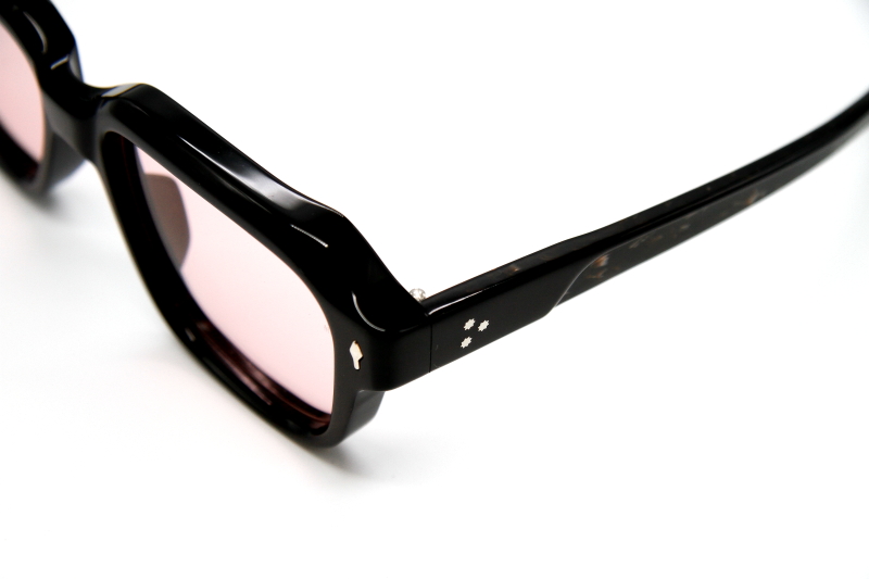 1960年代を彷彿とさせるスクウェア型サングラス。 智元が落ちたデザインは、男性的なウェリントン型とは違う ナードな雰囲気。フロントの矢じりの鋲飾りや テンプルの3鋲などの金属パーツがラグジュアリー。