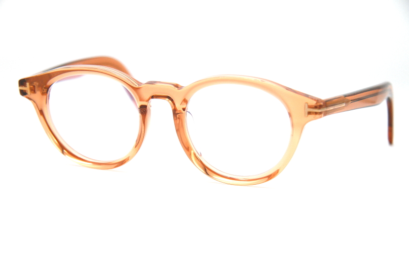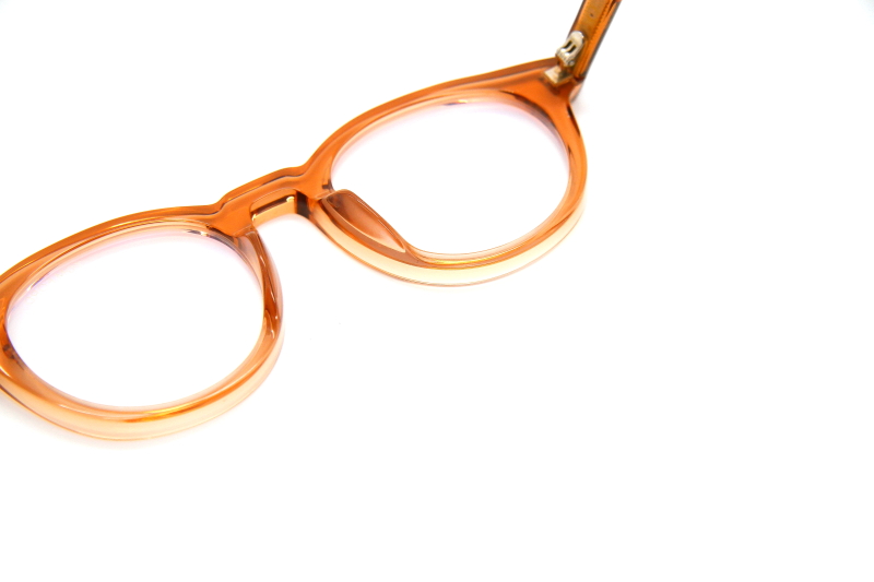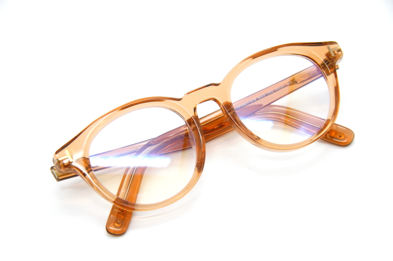 ボストン型のプラスチックフレーム。 ボストンタイプとしては大きめのサイズ感。 レンズに向かって入るカッティングが反射し 目元に美しさとさりげない立体感を演出。 女性がオーバーサイジングで掛けると良い雰囲気。