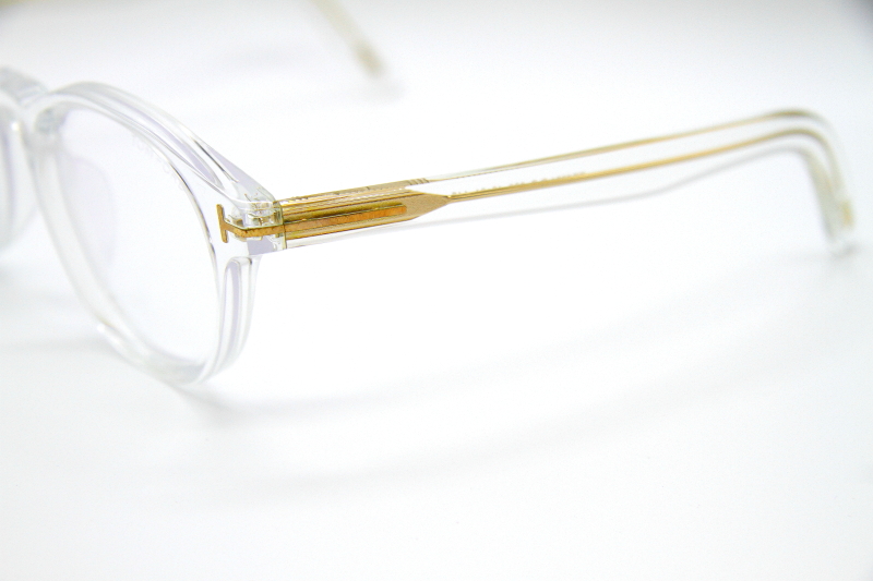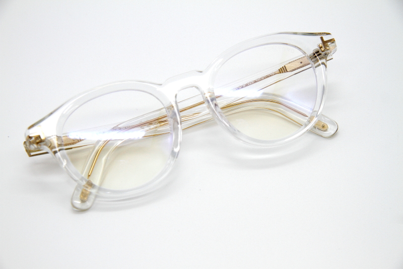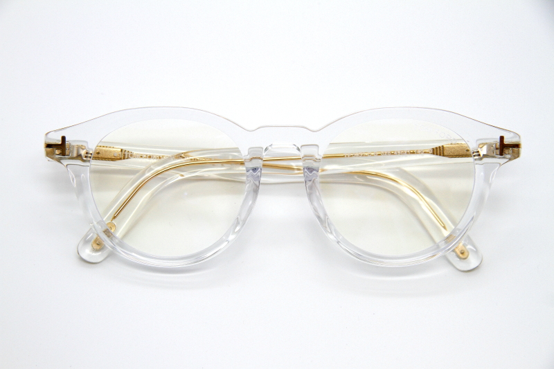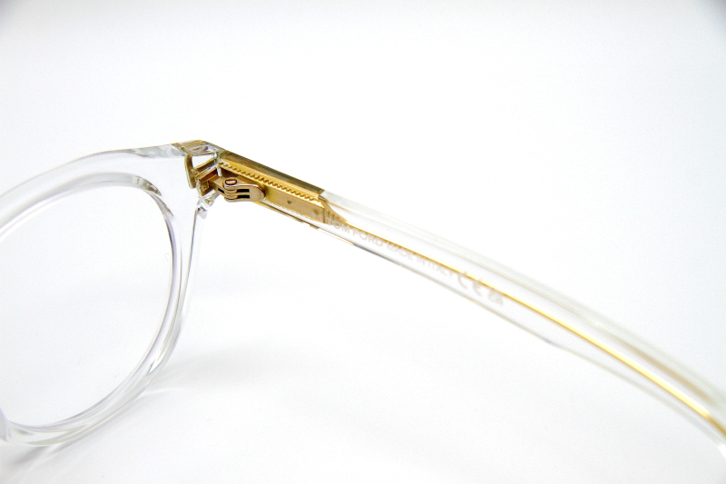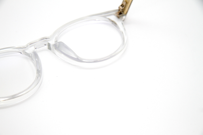 ボストン型のプラスチックフレーム。 ボストンタイプとしては大きめのサイズ感。 レンズに向かって入るカッティングが反射し 目元に美しさとさりげない立体感を演出。 女性がオーバーサイジングで掛けると良い雰囲気。