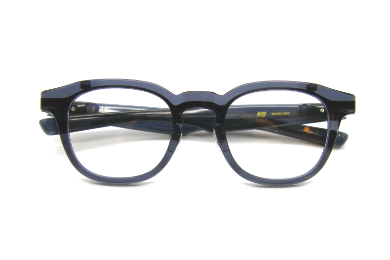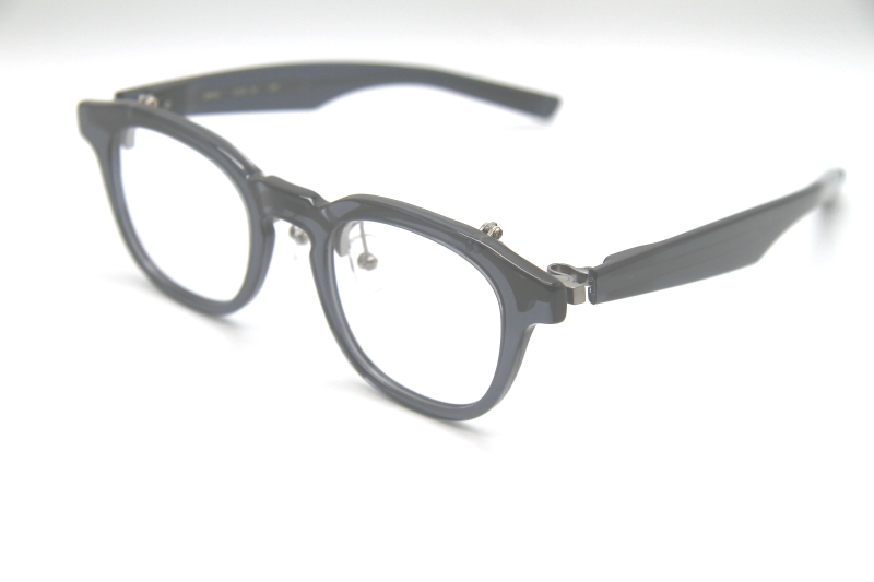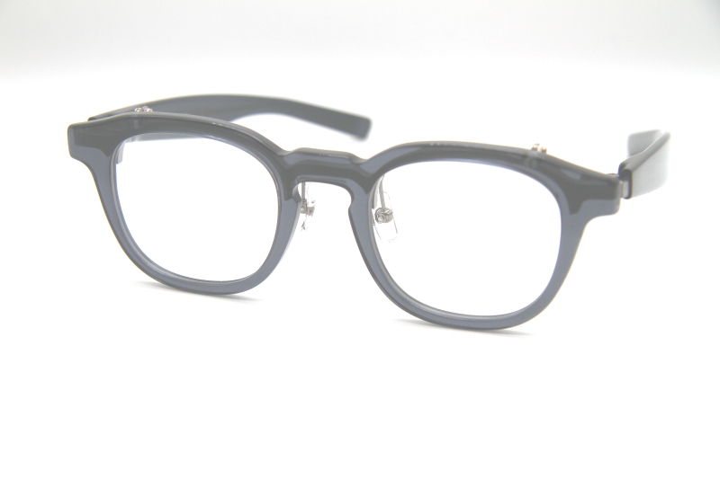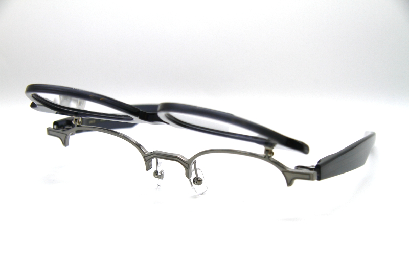 今では、定番といえるボスリントン型の跳ね上げ式フレーム。 アメリカンヴィンテージな雰囲気のミディアムサイズ。 スムーズな開閉と耐久性のあるフリップアップ構造は、 見た目には跳ね上げ式と分かりずらいほどの 違和感のない出来映え。 近方が見えにくい近視の方や 暗いときに跳ね上げるサングラス仕様など 多くの使い方ができるギミックたっぷりの眼鏡。