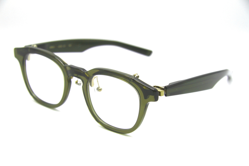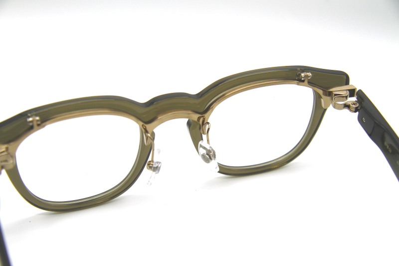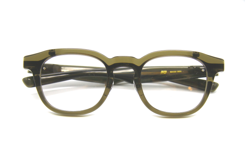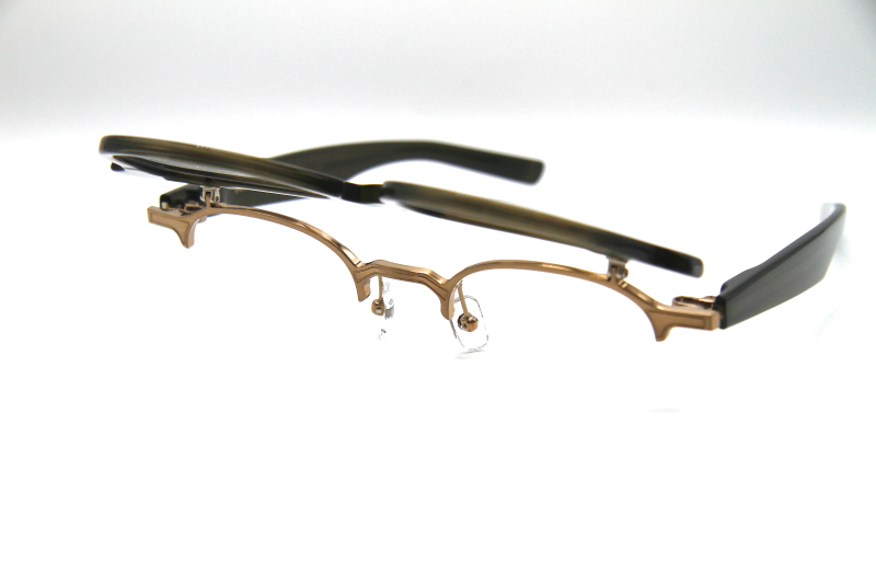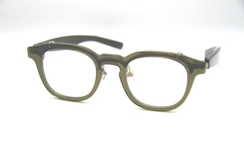 今では、定番といえるボスリントン型の跳ね上げ式フレーム。 アメリカンヴィンテージな雰囲気のミディアムサイズ。 スムーズな開閉と耐久性のあるフリップアップ構造は、 見た目には跳ね上げ式と分かりずらいほどの 違和感のない出来映え。 近方が見えにくい近視の方や 暗いときに跳ね上げるサングラス仕様など 多くの使い方ができるギミックたっぷりの眼鏡。