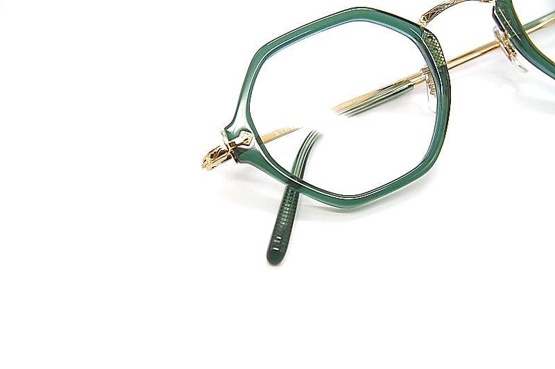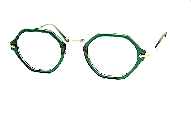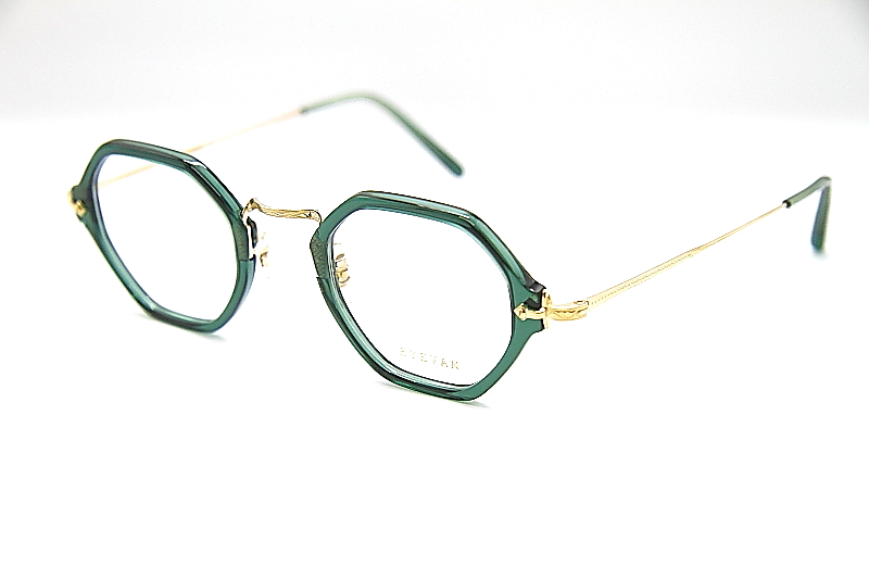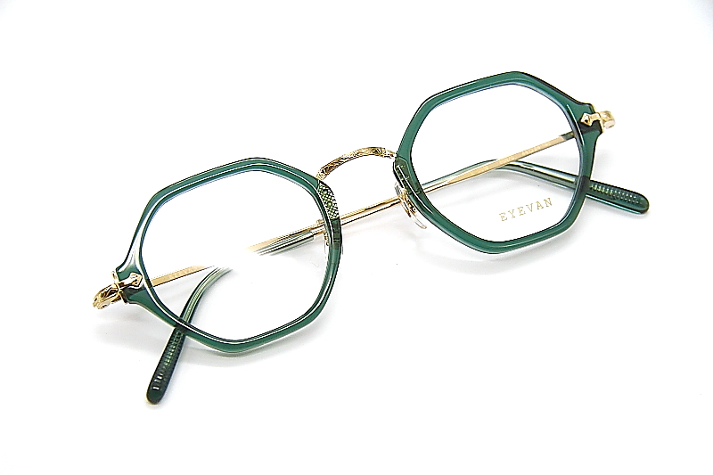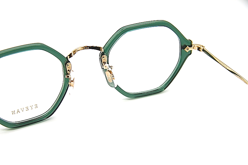 ヘキサゴンシェイプのコンビネーションフレーム。 EYEVANのアーカイブから着想を得たE-500番台シリーズ。 小ぶりなサイズ感のプラスチック枠に チタン素材のブリッジ一体型のバックリム構造。 βチタン製のテンプルや高めのクリングスアームなど クラシカルなデザインながら掛け心地も良く ジェンダレスなフレーム。