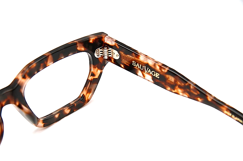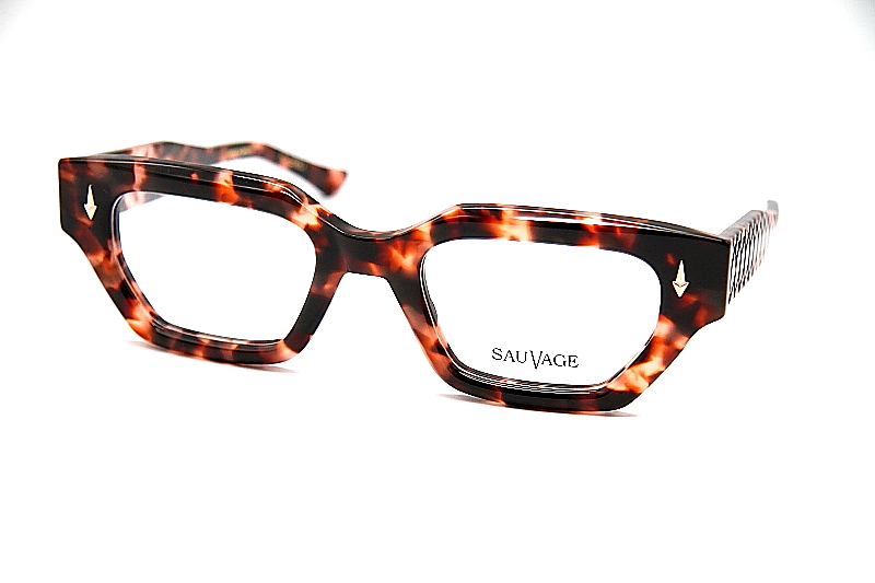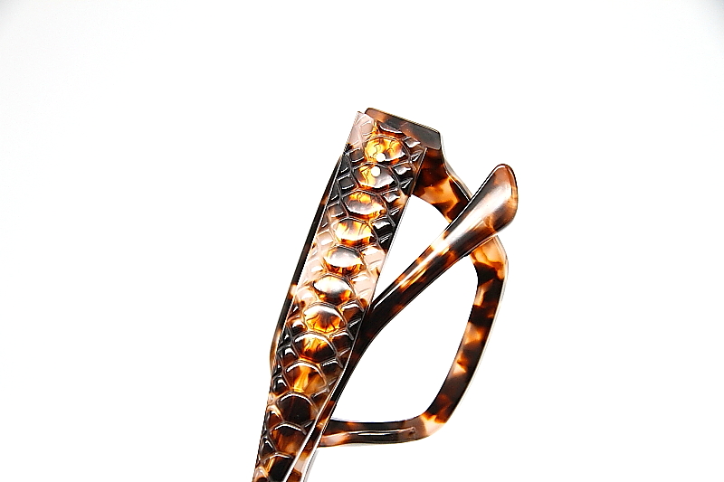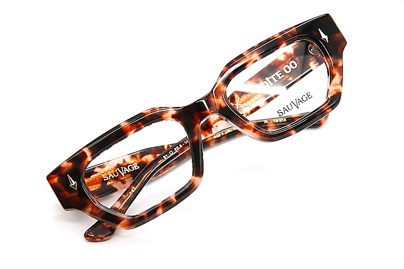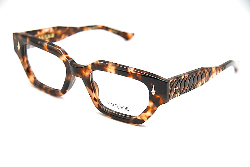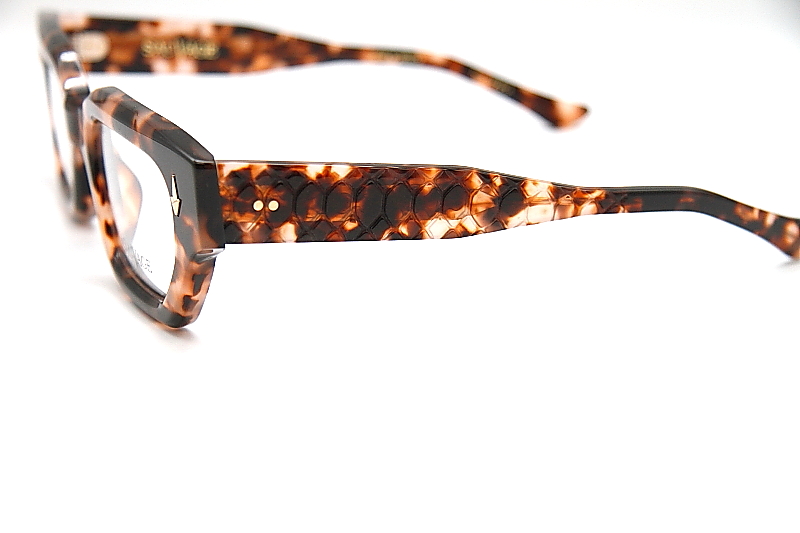 レクタングルシェイプのプラスチックフレーム。 フロント下部をカットしたシャープな印象と テンプルに施された凹凸感のある蛇柄の妖艶な 雰囲気がベストマッチ。 レンズカラーによってスタイルの変化を楽しめるフレーム。