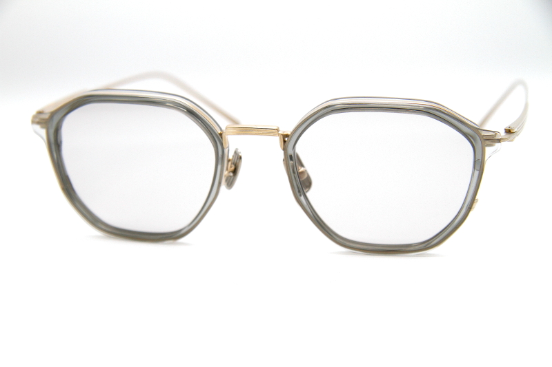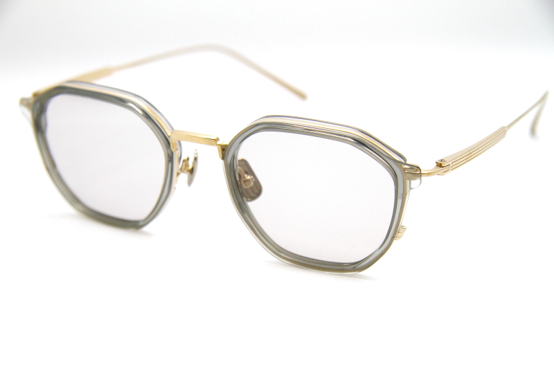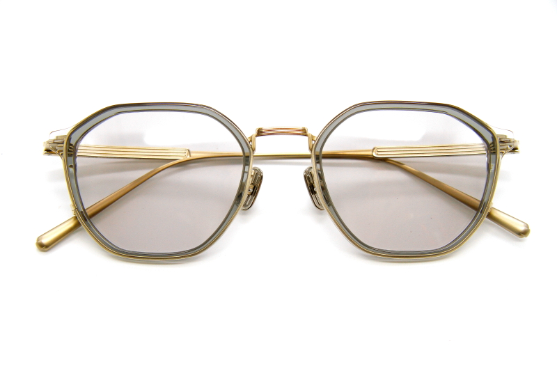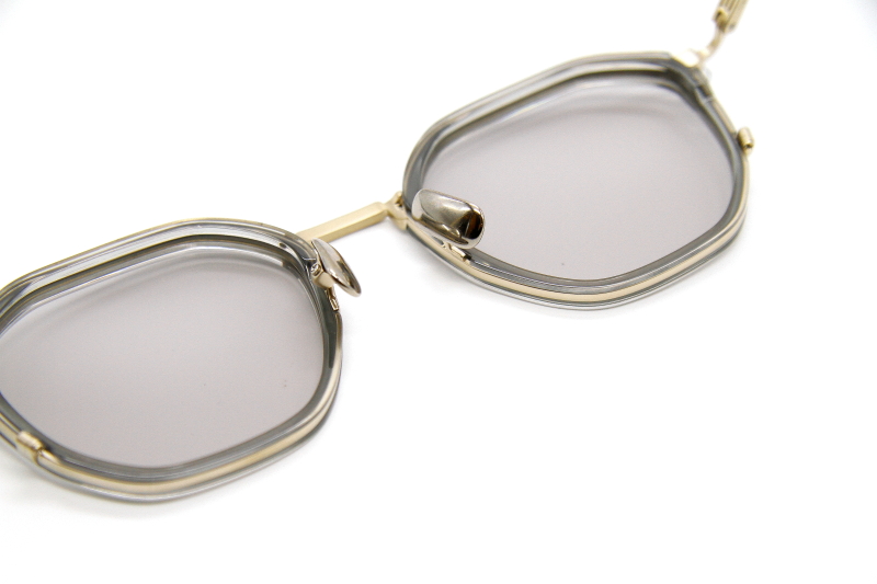 多角形型のコンビネーションフレーム。 プレス加工されたチタニウム製のリムに 立体化のあるプラスチックリムをセット エッジの効いたデザインが都会的な雰囲気。