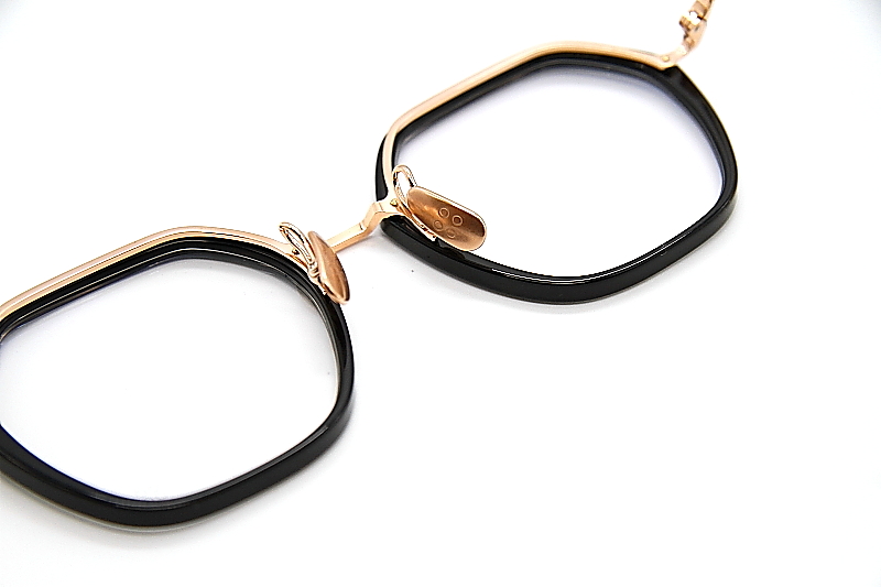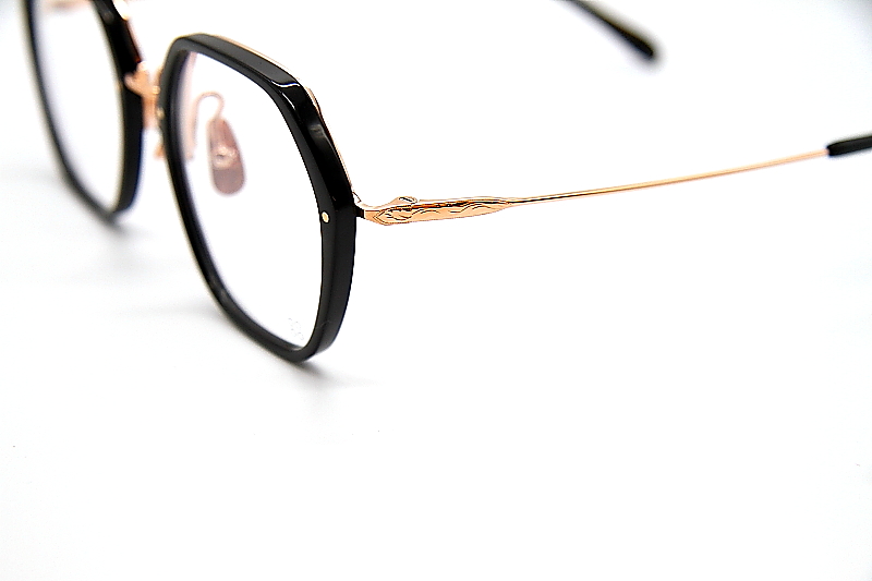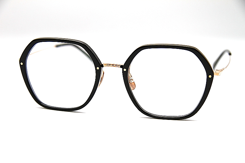 多角形型のコンビネーションフレーム。 細いプラスチック製のリムにチタン製のバックリム構造が デザイン性と掛け心地の良さを両立。 シンプルでありながら凛とした存在感を放つモデル。