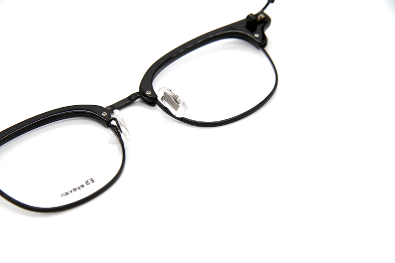 天地を抑えたサーモントブロータイプ。 やや丸みを帯びたレンズシェイプで 比較的柔らかな印象のデザイン。 L字型の丁番や圧縮プラスチックで 見た目以上に軽く掛けやすくフレーム。