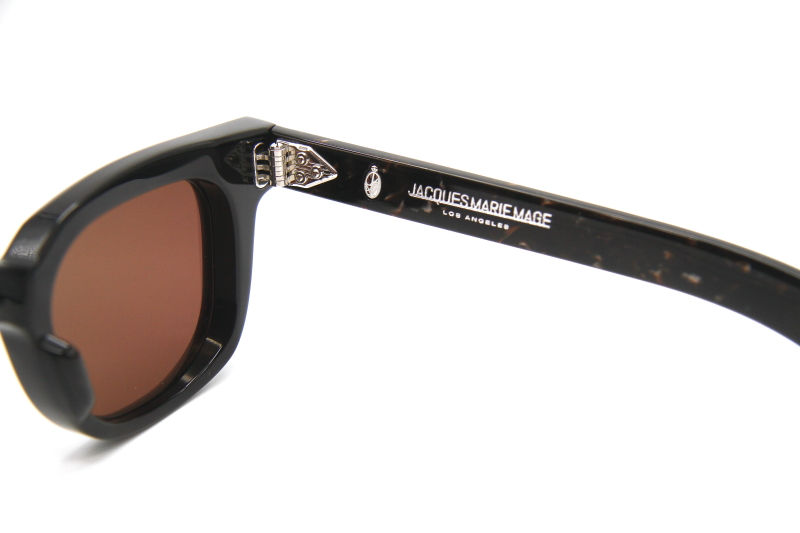 ブラックの生地で制作されたフロント テンプルは、ブラックの生地に茶系の柄生地の張り合わせ。