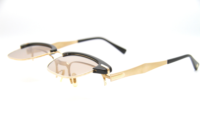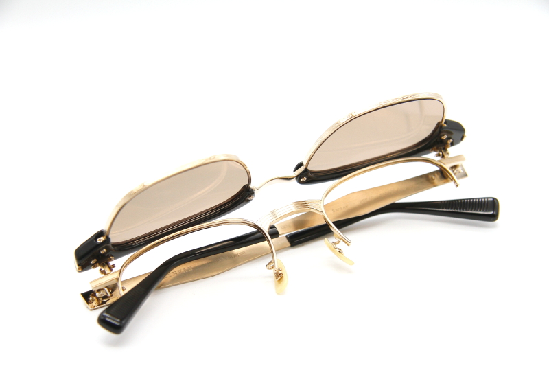 EYEVAN初となるサーモントブロータイプの 跳ね上げ式フレーム。 50年代のアメリカンヴィンテージから着想を得た デザインは、初代EYVANチームから継承した物。 当時のデザインをもとにサイズ感やマテリアルなどを 見直し現代的にリプロダクトしたデザイン。 フロント内側にはレンズをはめられる構造があり 度付きレンズを入れた複式の跳ね上げとしても使用可能。